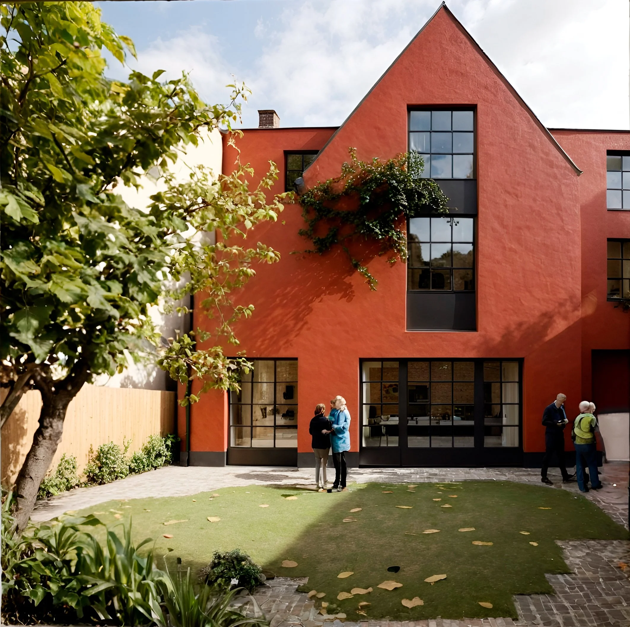 Parcelle en lanière entre deux maisons individuelles en briques rouges.