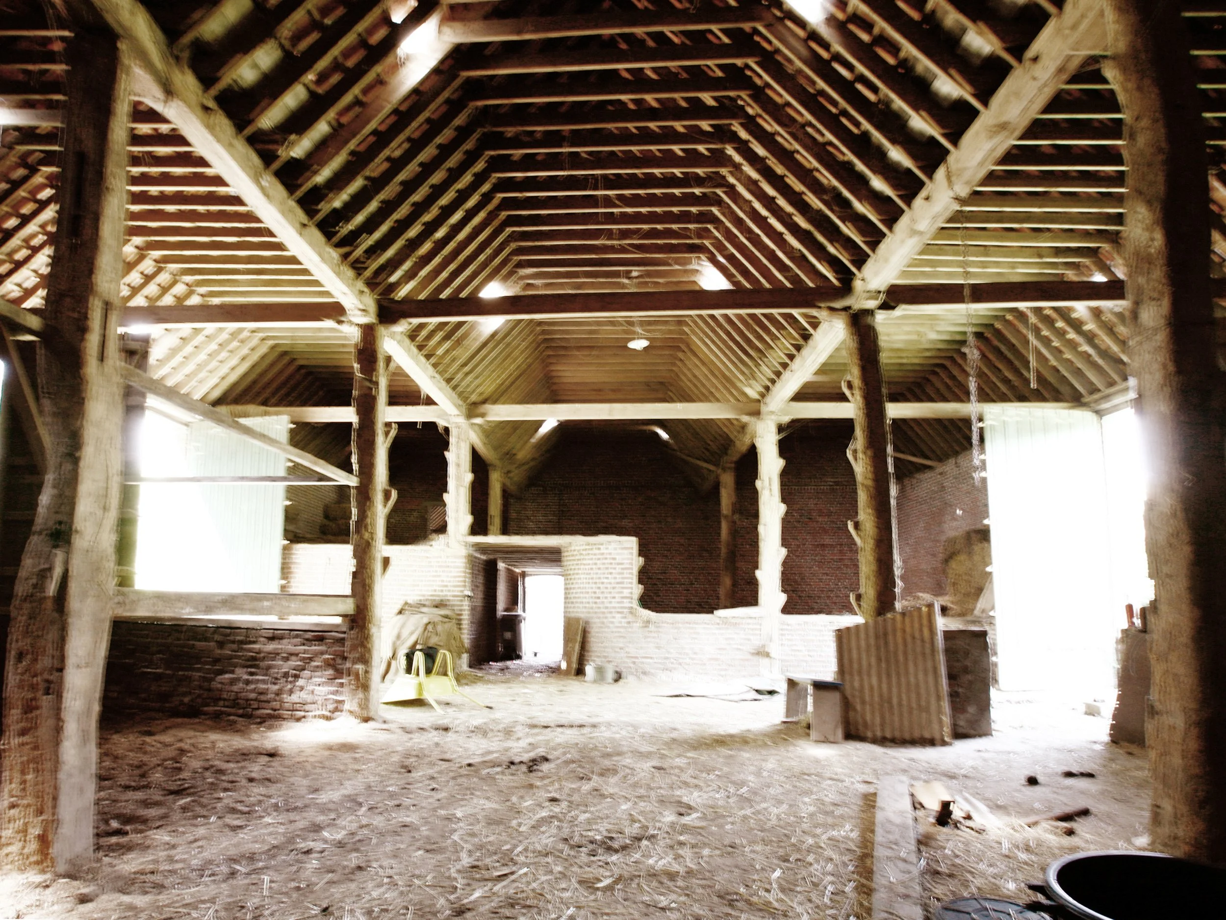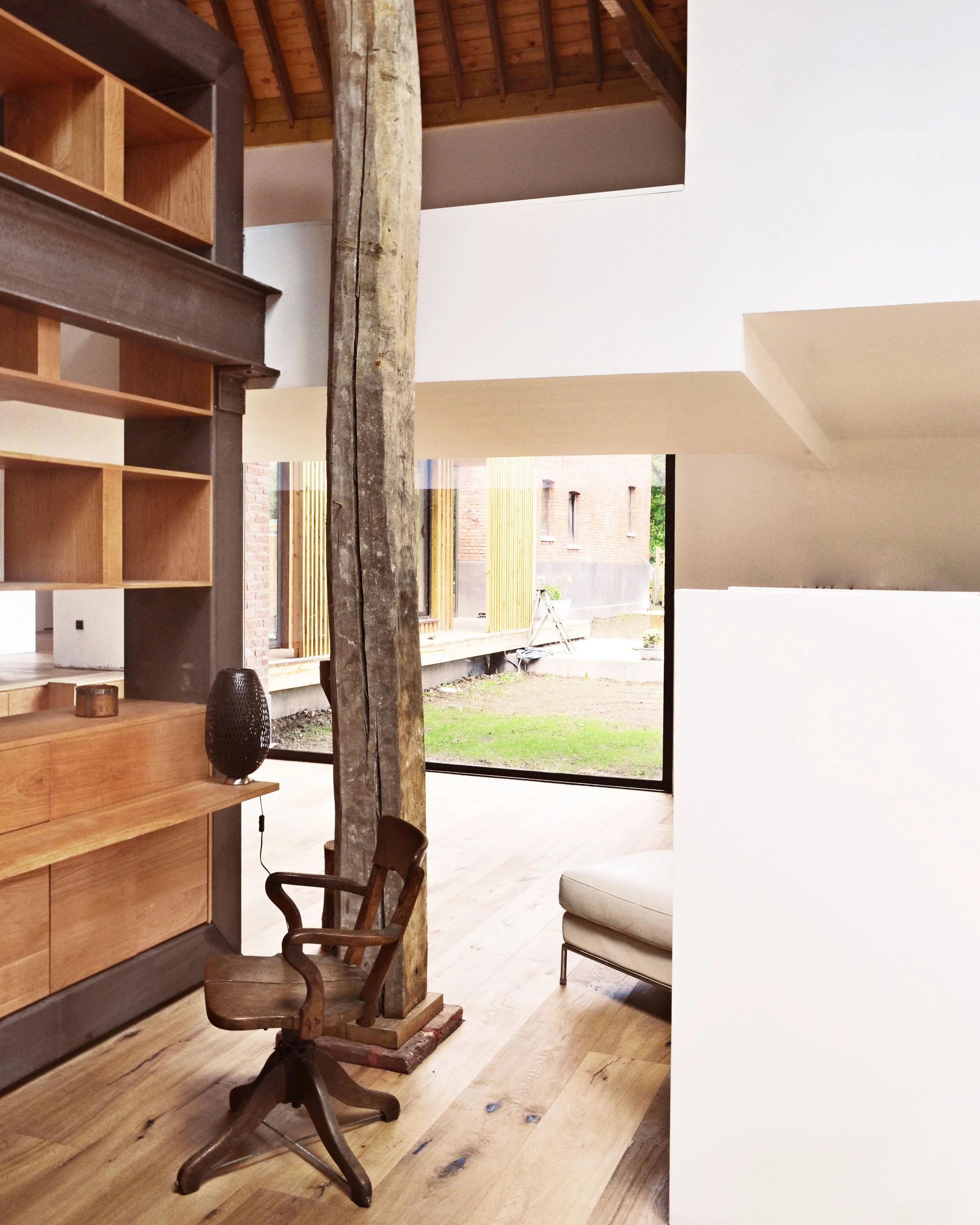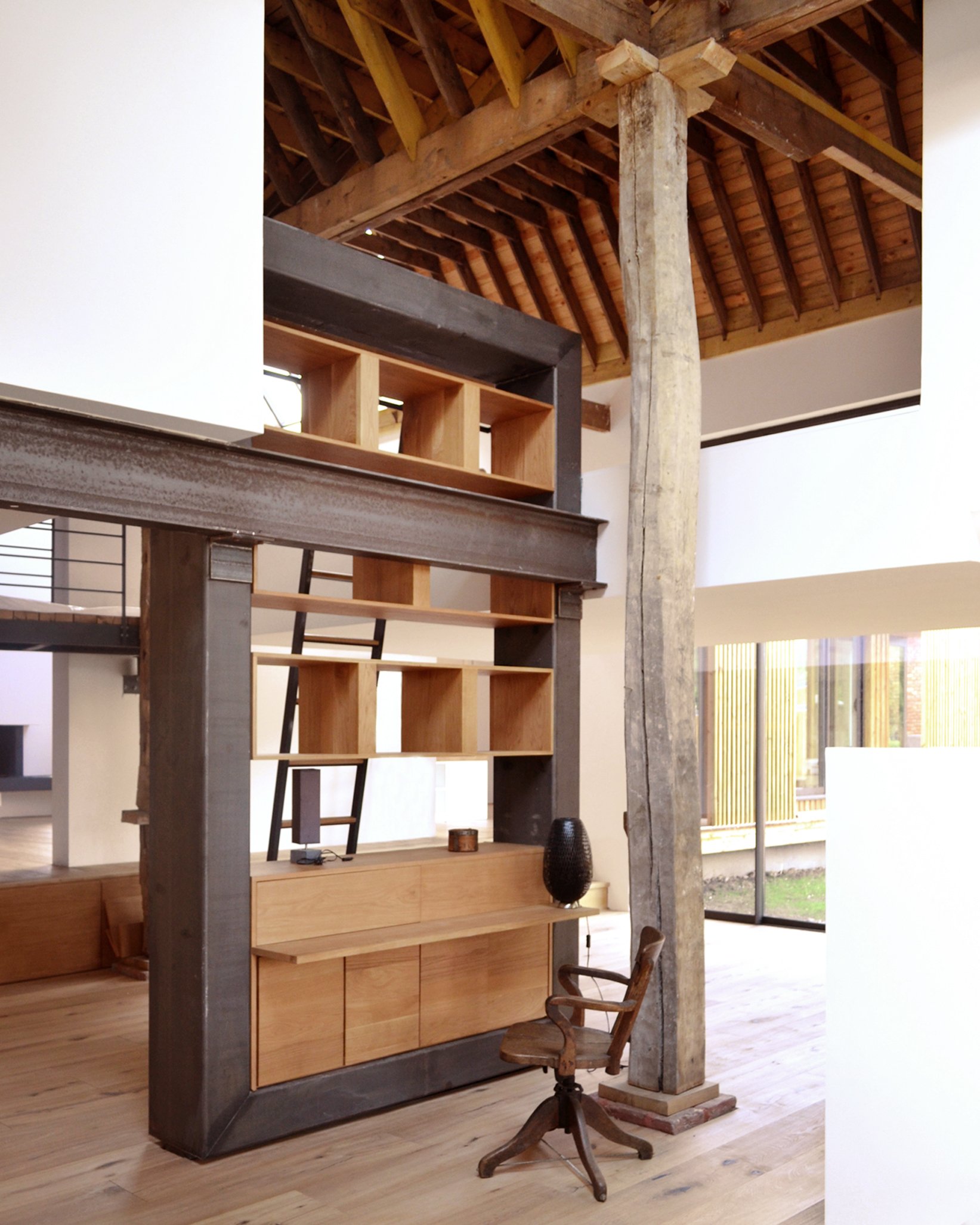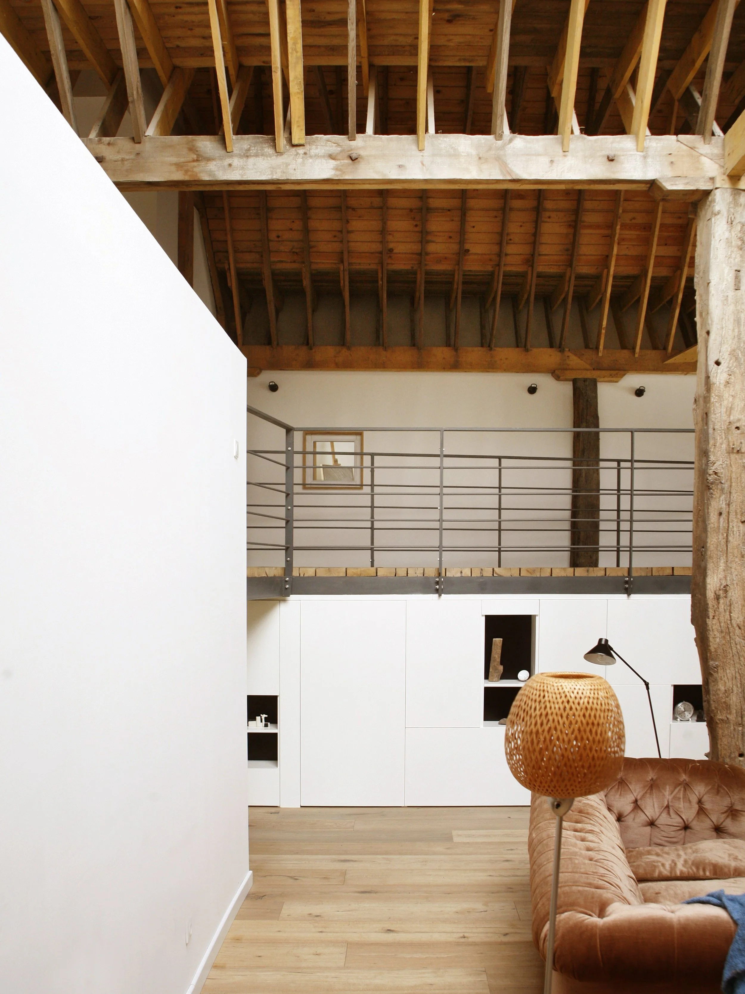 La double hauteur de la grange est mis en valeur par l’implantation de volumétries blanches librement suspendues et reliées par une passerelle en acier se déployant autour de la charpente ancienne.